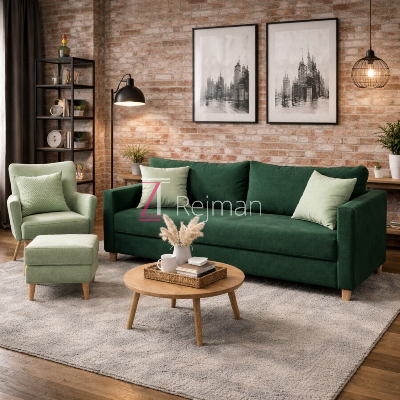 Nowoczesny zestaw wypoczynkowy składający się z trzyosobowej sofy, fotela oraz pufy, zaprojektowany z myślą o komforcie i estetyce. Prosta, geometryczna forma oraz subtelnie wyprofilowane podłokietniki nadają meblom elegancki, ponadczasowy charakter. Całość osadzona jest na stabilnych, drewnianych nóżkach, co dodaje lekkości konstrukcji i ułatwia utrzymanie czystości.